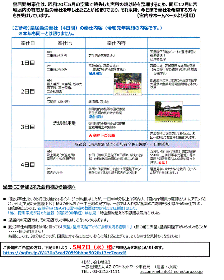 4日間の非日常的な奉仕活動と普段接することのあまりない皇居・赤坂御用地に身を置くことで、心に響く何かを感じることが出来るものと存じます。